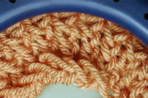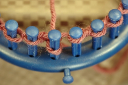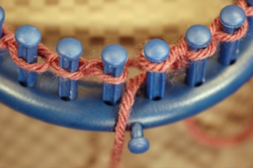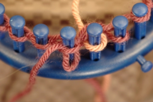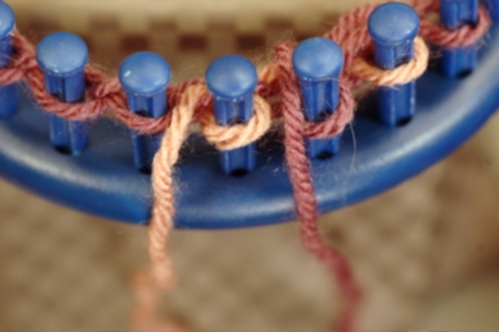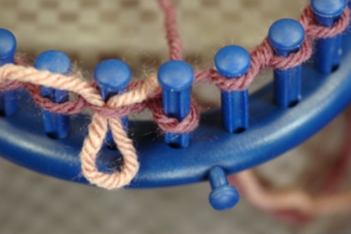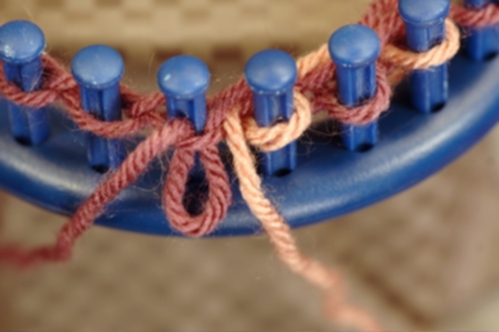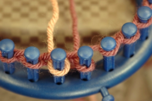 Knit off the stitch on peg. In this example, a knit stitch is used but you can use whatever stitch is called for in the pattern.