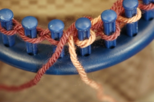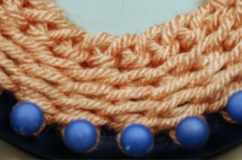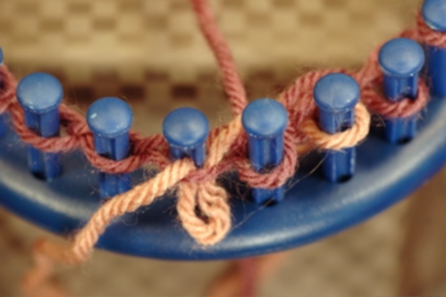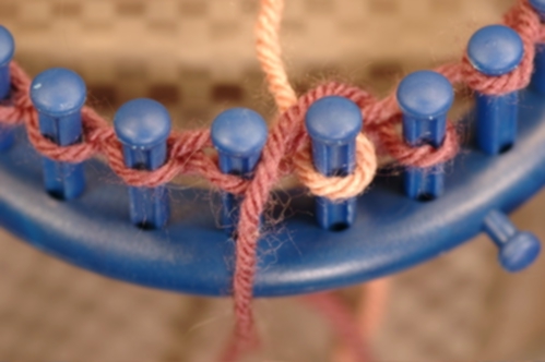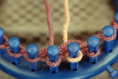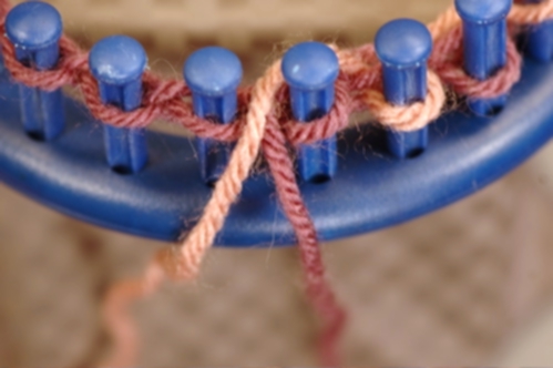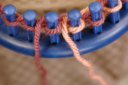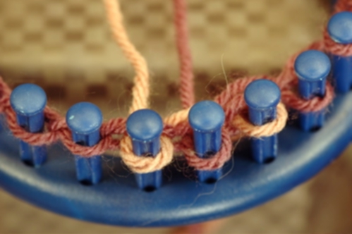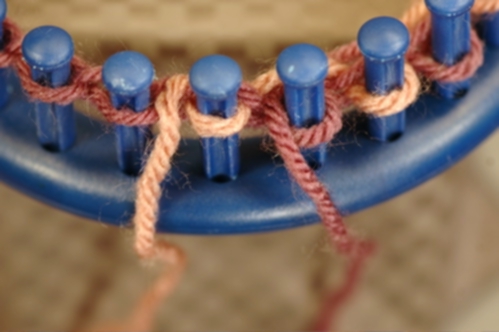 The Non-Tradition method works in a similar manner as the Traditional except that the working yarn crosses in back, not in front of the other yarn. To help you accomplish this, lay the yarns in front of the pegs instead of behind. Now, when you cross the working yarn, it will cross behind. Make sure that the yarns do not cross at any other time and keep them from becoming twisted. See Tips above for ideas on how to do this.
